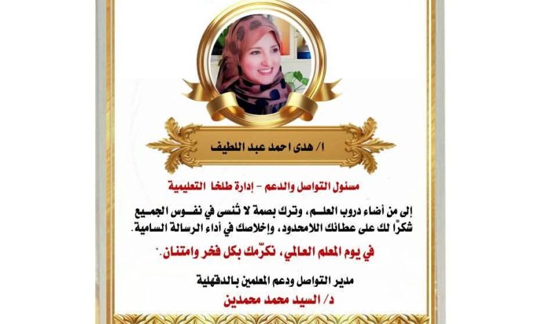 ومسؤول التواصل ودعم المعلمين بمناسبة حصولها على درع التميز في يوم المعلم العالمي من إدارة التواصل ودعم المعلمين بالدقهلية بقيادة د/ السيد محمد محمدين